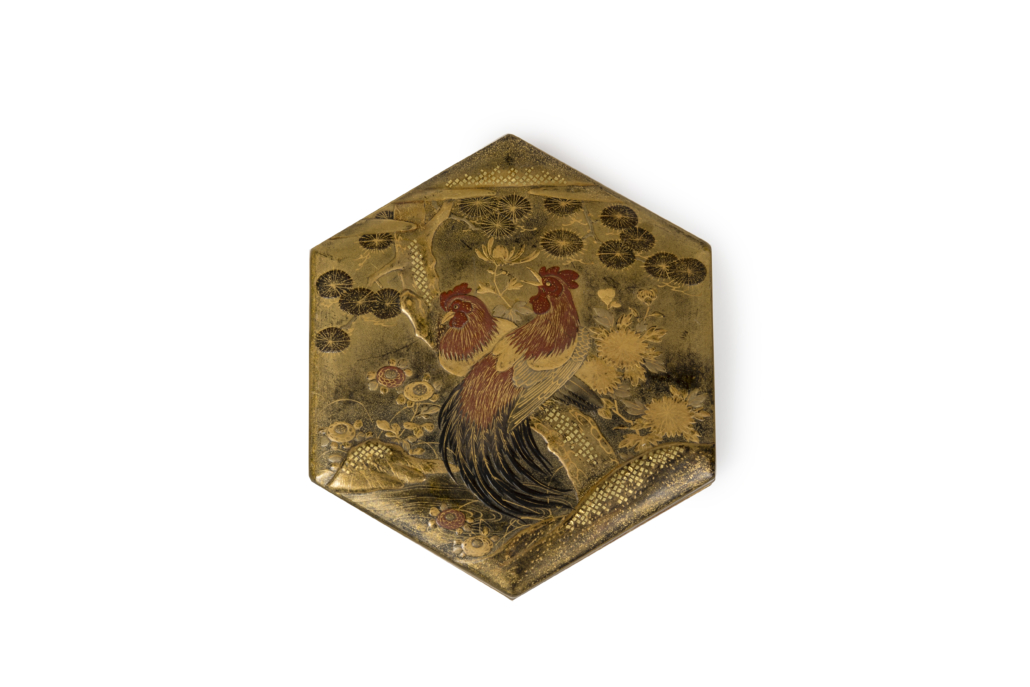 This small hexagonal kobako presents a rich scene featuring two roosters perched on a pine tree, set within an abundant natural landscape. The sides of the composition are adorned with peonies and chrysanthemums, each element rich in symbolic significance.