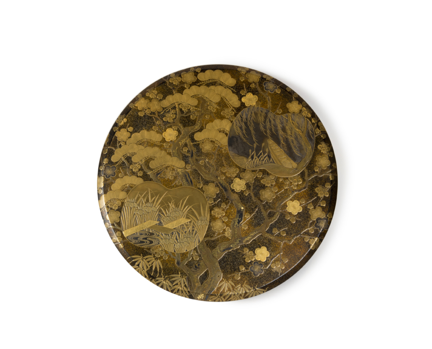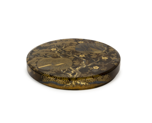 Impressive suzuribako writing box decorated in gold and tin maki-e lacquer on a nashiji ground. The lid is adorned with a composition depicting a pine and a plum tree whose trunks intertwine, with young bamboo shoots growing at their base. The branches and blossoms of both trees fill the entire surface, except for two fan-shaped reserves.