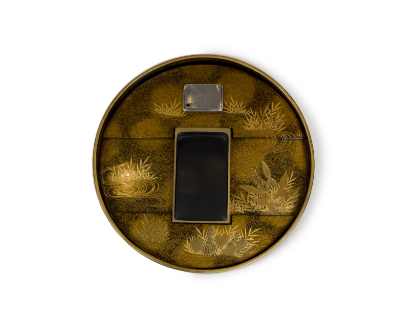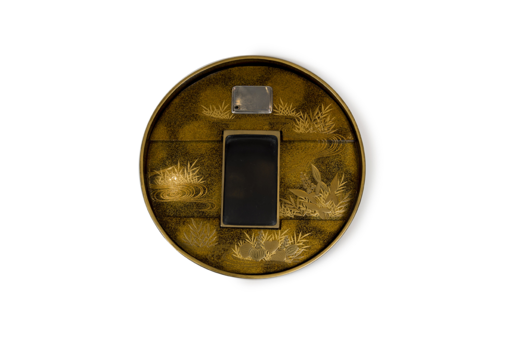 The writing box contains its inkstone and its suiteki (water dropper), rectangular in form and crafted from silver sheet.