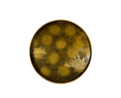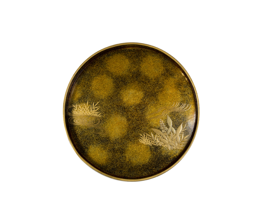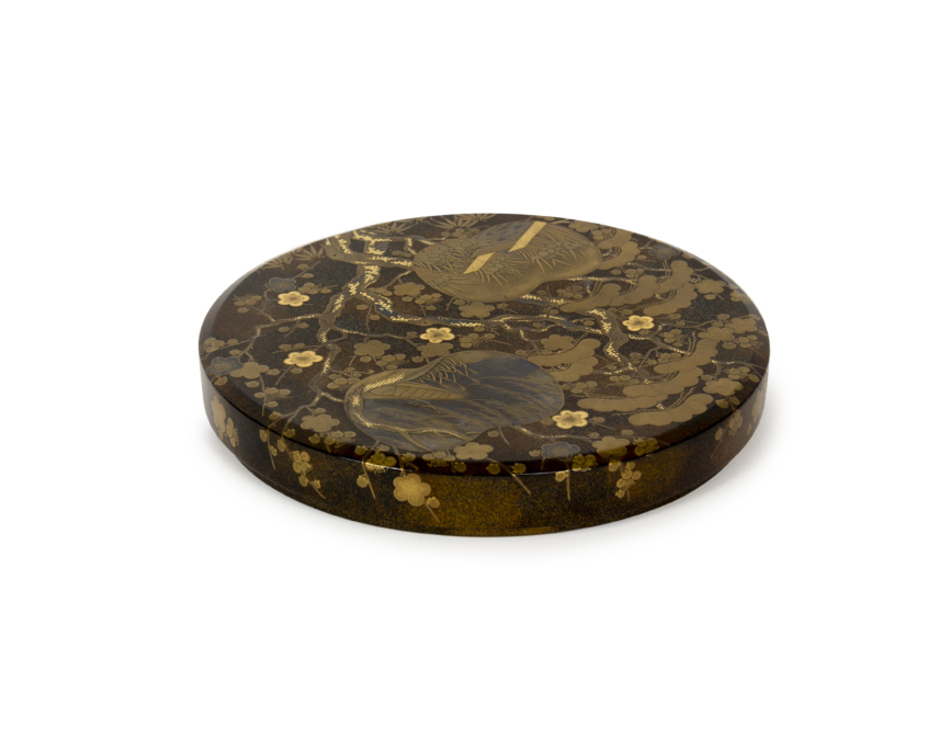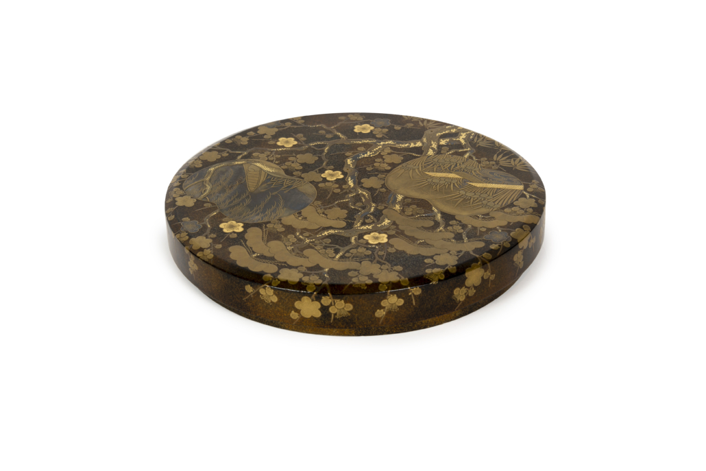 The interior of the lid features a more understated decoration of physalis leaves and husks about to open. The simplified treatment evokes early spring and the precocity of the young fruit, yet each is executed with care in maki-e, many enhanced with small kirigane gold inlays.