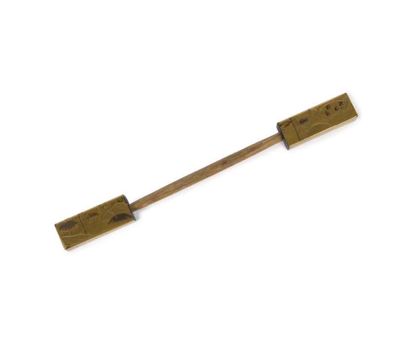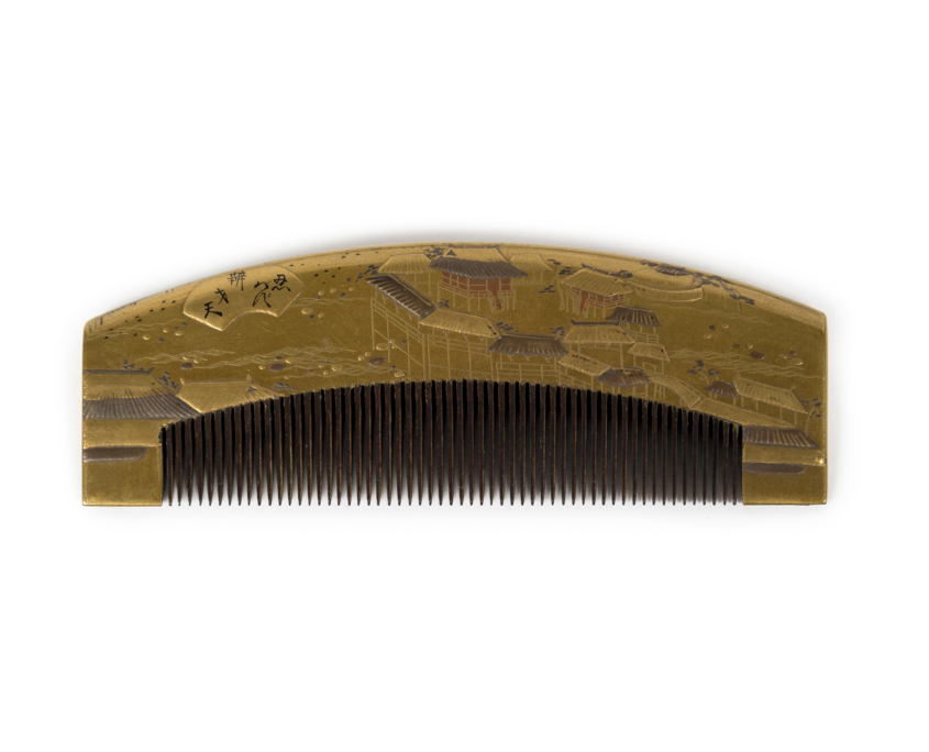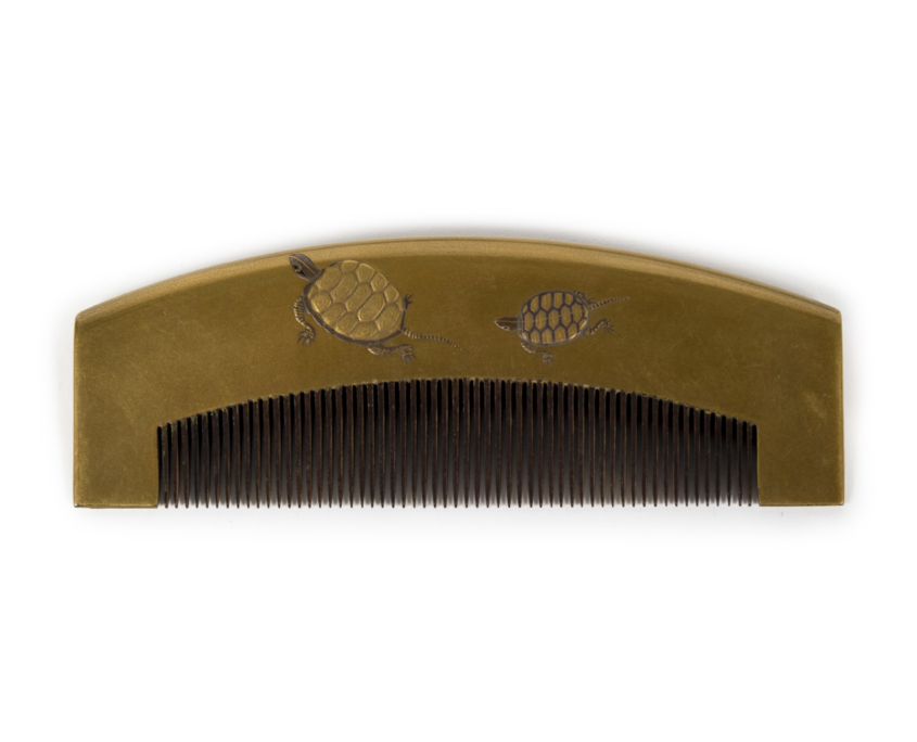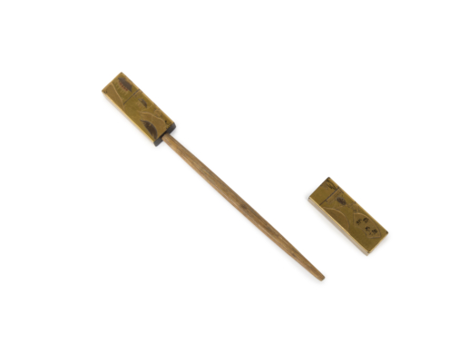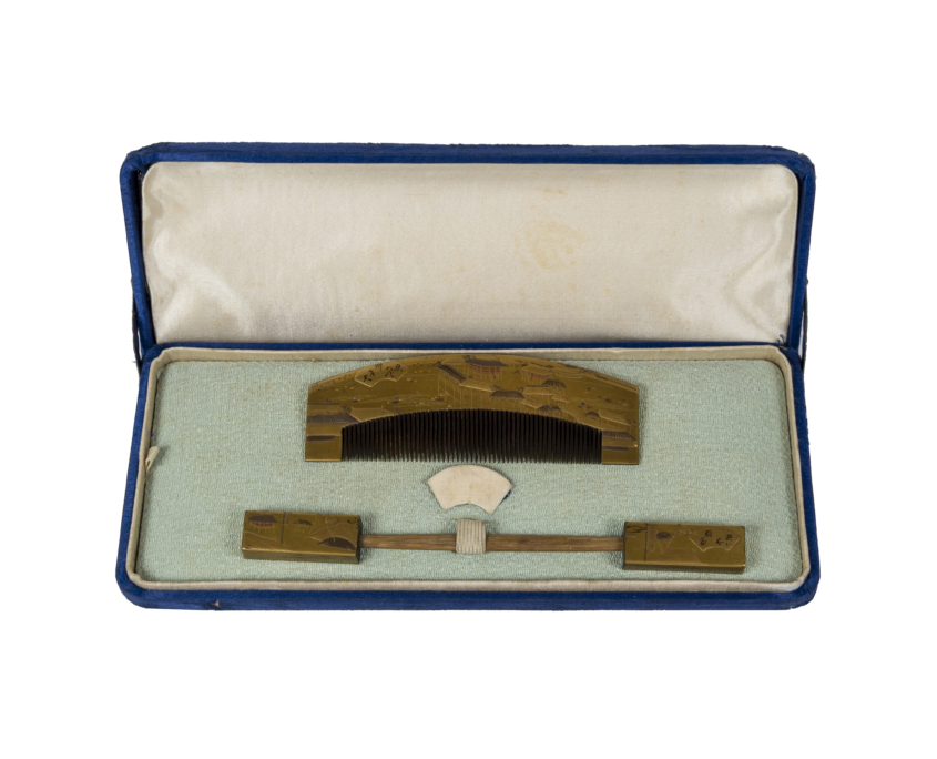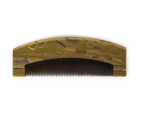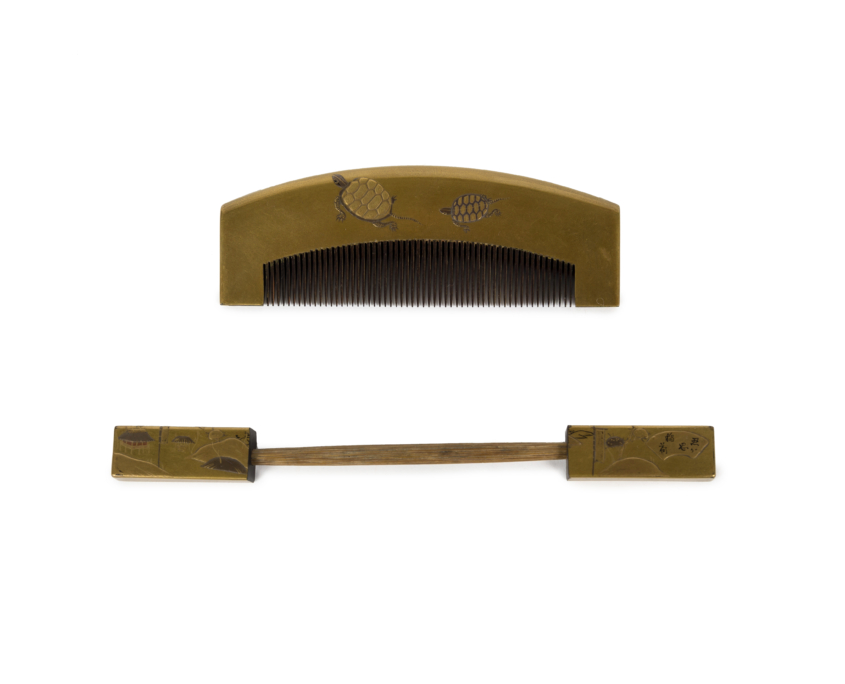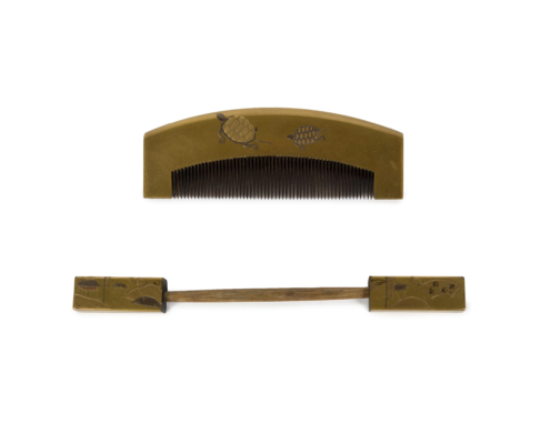 Élégants peigne et pique-cheveux en bois laqué or décorés en maki-e de paysage et d’animaux.