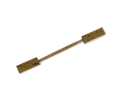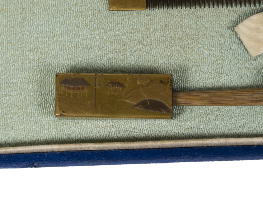 Le peigne est décoré sur une face de pavillons dans un paysage et sur l’autre face de deux tortues. La décoration du pique-cheveux reprend le style du peigne, formant un ensemble cohérent. Les deux extrémités du pique à cheveux sont décorées sur une face de pavillons dans un paysage de montagnes et d’arbres et sur l’autre face de trois tortues, deux d’un côté, une grande et une petite, et une de l’autre. Une gravure fine représente le courant de l’eau. Le manche central est en bois.