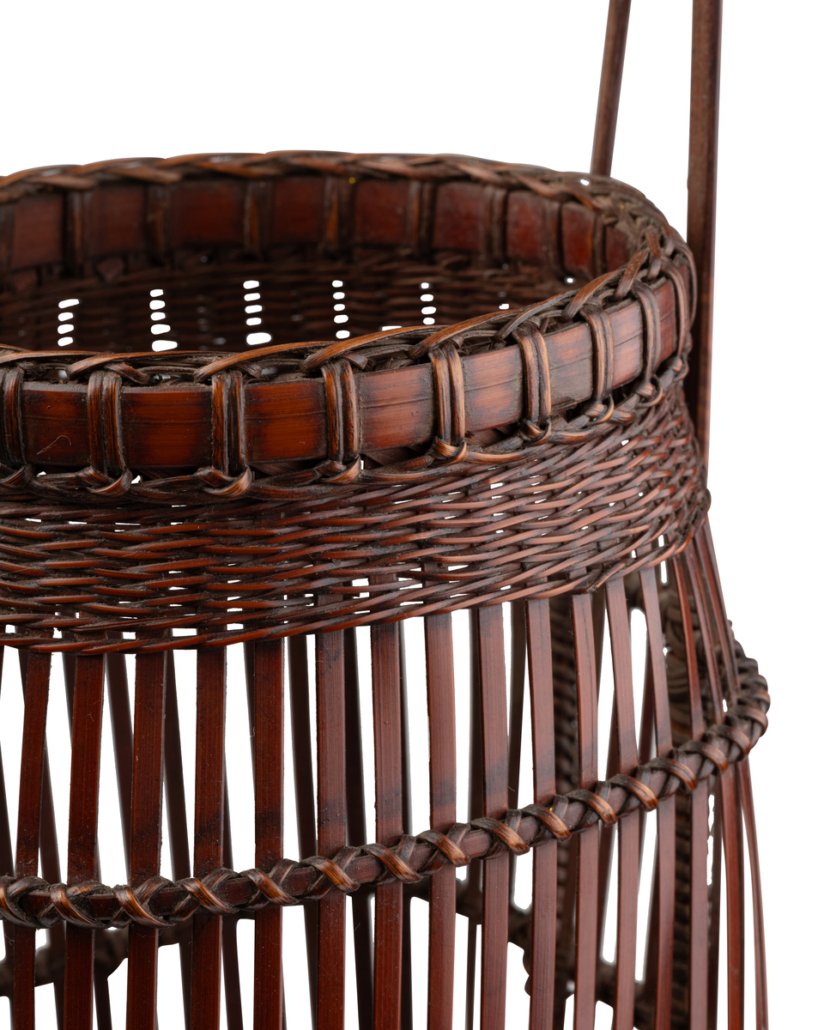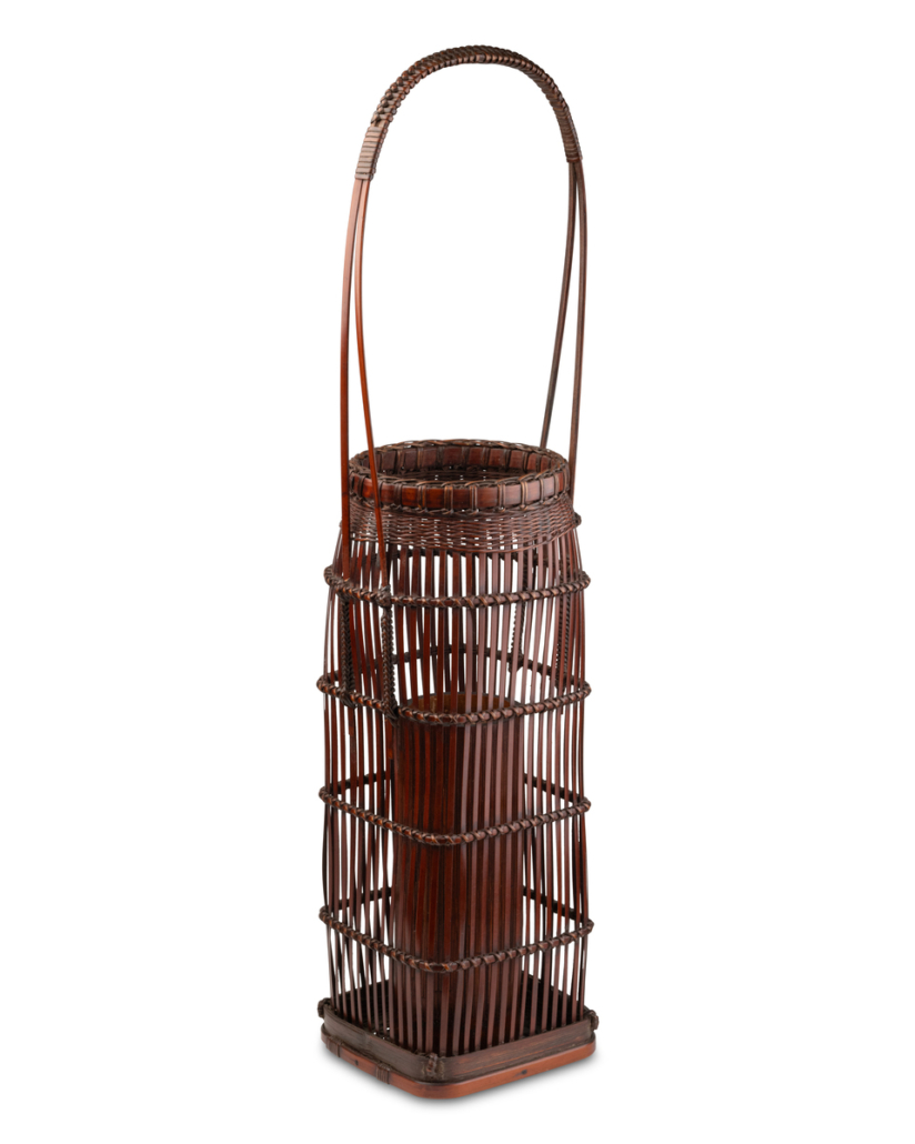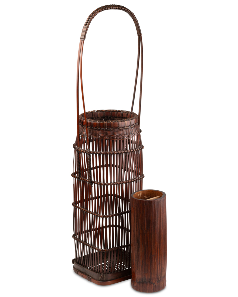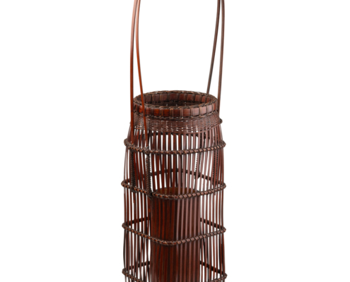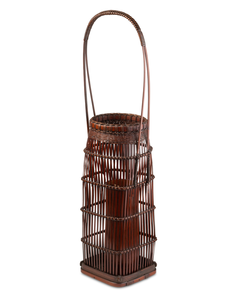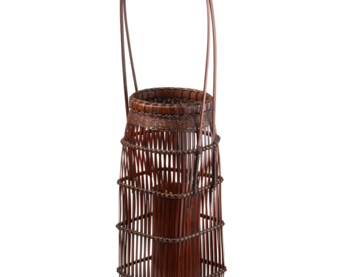 Panier à ikebana (hanakago) en vannerie de bambou et de rotin recouverts d’un vernis de laque clair avec son otoshi (vase intérieur) en section de bambou laquée. Le tissage du corps en maille droite et symétrique. La longue anse en partie torsadée est maintenue au corps même par un tissage torsadé et symétrique.