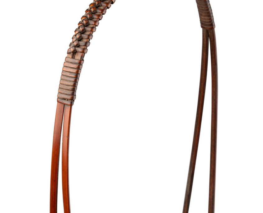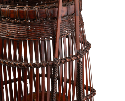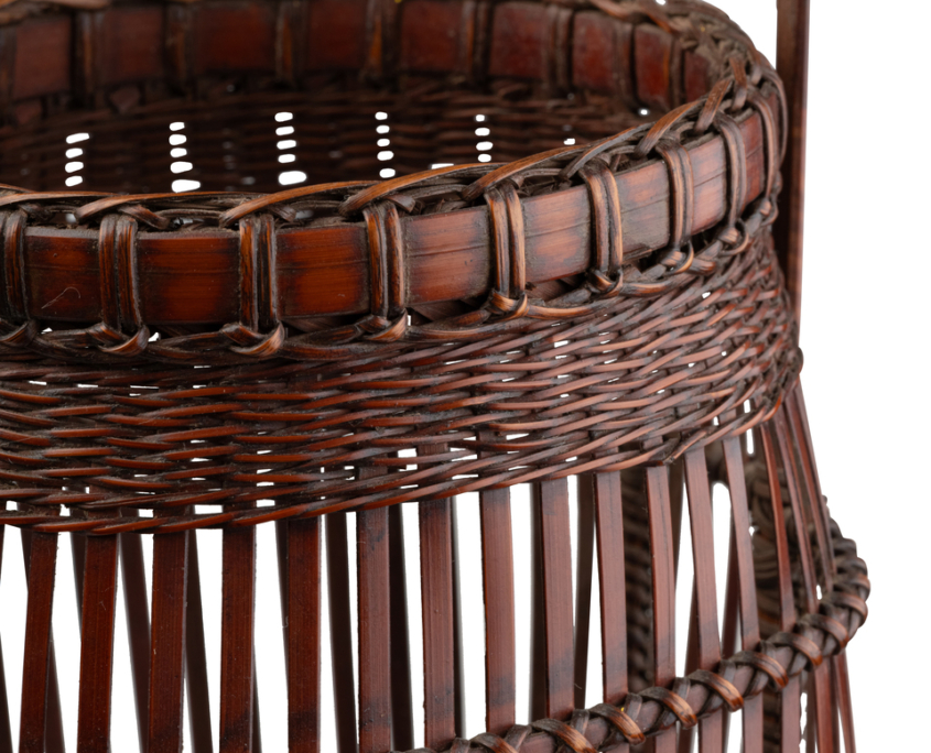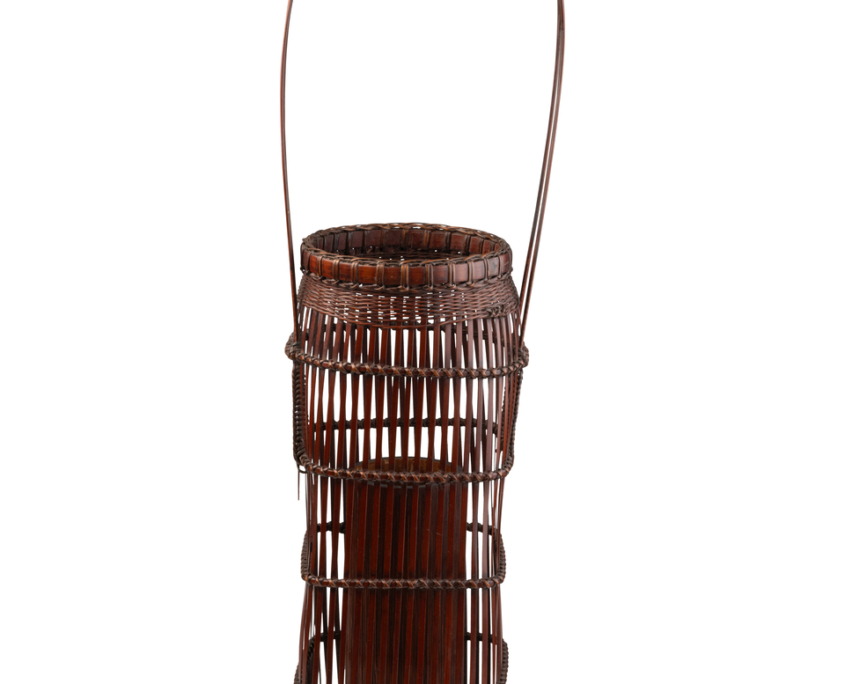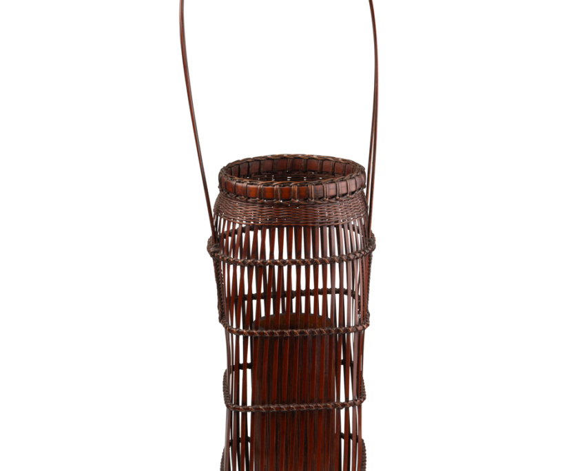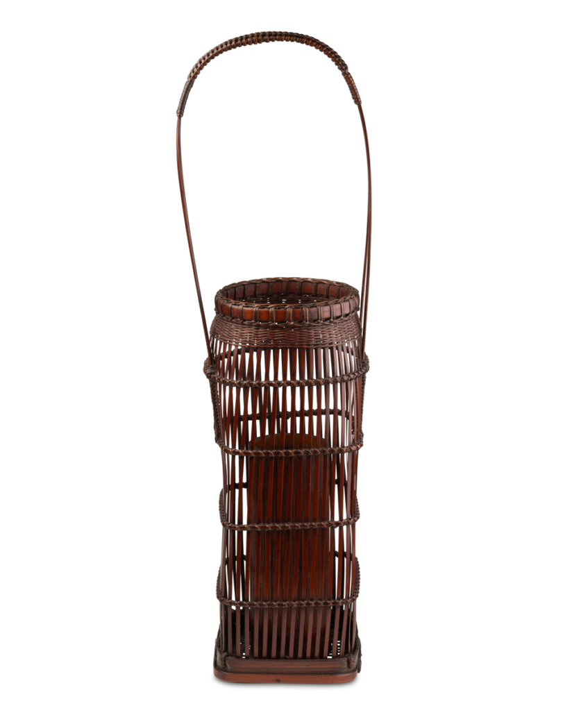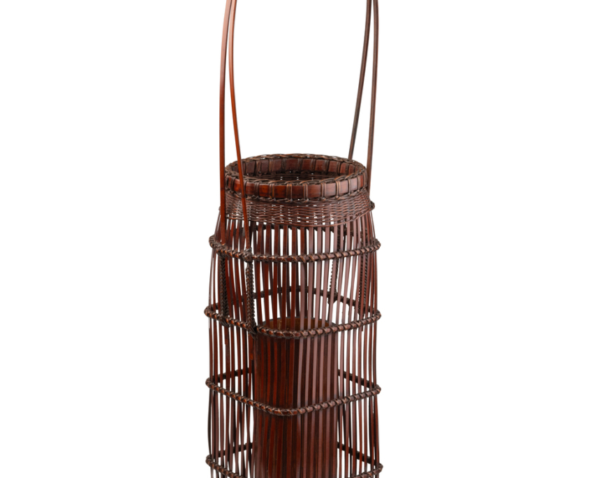 Panier à ikebana (hanakago) en vannerie de bambou et de rotin recouverts d’un vernis de laque clair avec son otoshi (vase intérieur) en section de bambou laquée. Le tissage du corps en maille droite et symétrique. La longue anse en partie torsadée est maintenue au corps même par un tissage torsadé et symétrique.