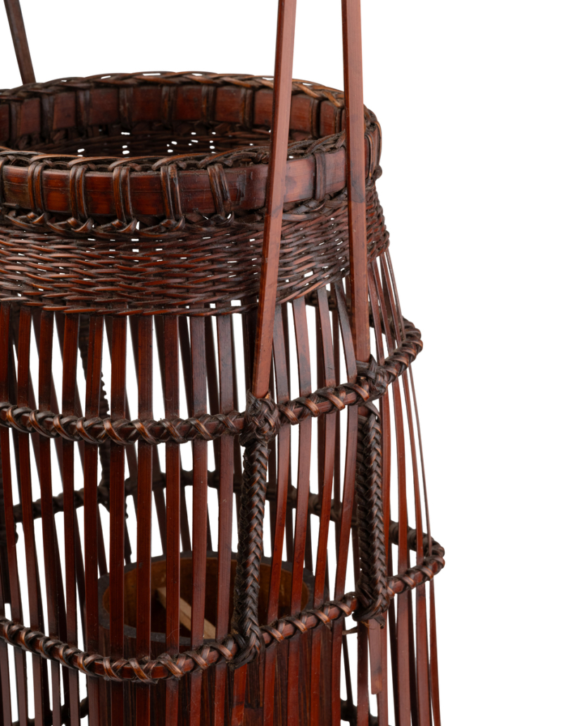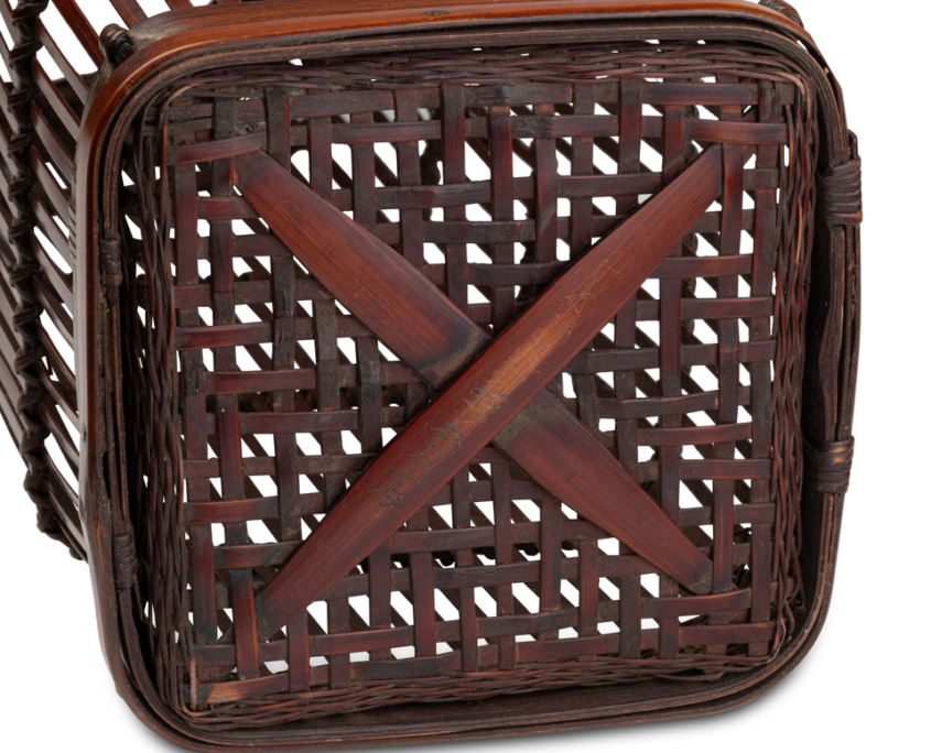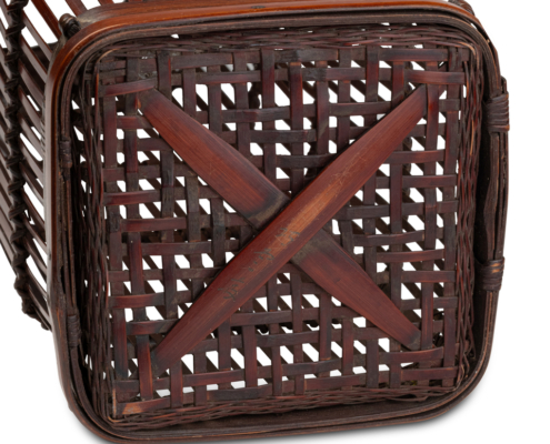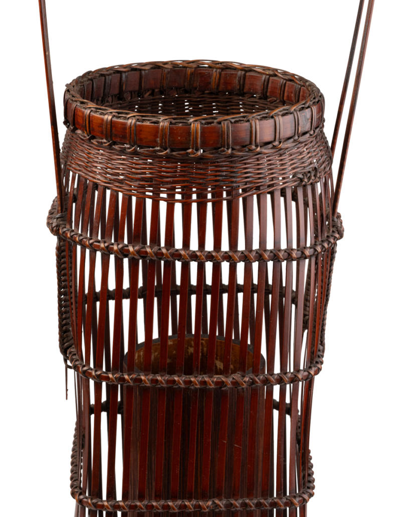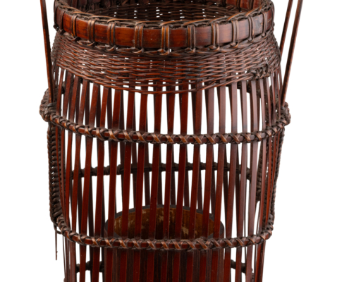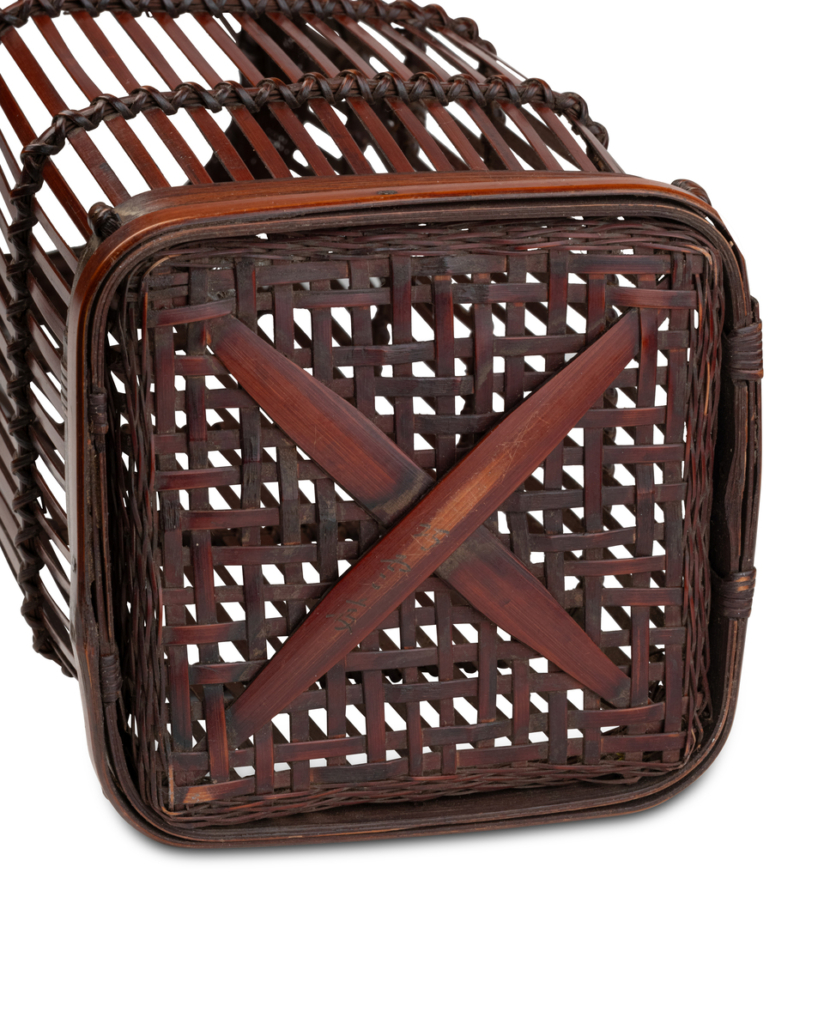 L’art de travailler le bambou prend ses racines, au Japon, au cours de la période Jōmon (13 000 – 400 av. J.-C.) : la première de ces réalisations en bambou fut en effet découverte sur le site de Korekawa dans la préfecture d’Aomori, située dans le nord de Honshu, la plus grande des îles du Japon. Fait de lamelles de bambous tressées puis laquées selon la technique dite rantai et datée de la fin de la période Jomon, ce récipient témoigne du développement, il y a plus de 3000 ans, de techniques de tressage de bambou ainsi que de la pratique du laquage, laquelle fut, et est encore caractéristique de l’art japonais. La vannerie de bambou se poursuit au cours des périodes Yayoi (800 – 400 av J.-C. – 250 ap J.-C.) et Kofun (250 – 538) sous la forme de peignes ornementaux. C’est à partir de l’époque de Nara (710 – 794) qu’apparaissent les premiers ouvrages en bambou destinés à la décoration florale, notamment durant le règne de l’empereur Shomu (701 – 756). Cette mode s’accélère à partir du XVe siècle, durant l’époque de Muromachi (1336 – 1573) : la fin de règne du shogun Ashikaga Yoshimitsu (1358 – 1408) voit l’ouverture du Japon au commerce avec la Chine des Ming (1368 – 1644), et ainsi l’arrivée d’objets chinois, les karamono, dans les grands centres urbains de l’archipel. Parmi ces objets, dont la réalisation remonte pour certains à la dynastie Song (960 – 1279), se trouvent ainsi nombre de vanneries de bambou, destinées à recevoir des fleurs dans le cadre des cérémonies du thé. Importé de Chine dès le XIIe siècle par des moines bouddhistes japonais, et plus spécifiquement par le moine zen Eisai (1141 – 1215), le cérémonial attaché au service du thé évolua entre les époques Muromachi et Azuchi Momoyama (1573 – 1603) : initiés par le moine zen Murata Shuko (1422 – 1502), ces changements attinrent leur apogée sous l’influence du maître de thé Sen no Rikyu (1522 – 1591), lequel formalisa définitivement le chanoyu, la cérémonie du thé japonaise encore pratiquée aujourd’hui. L’austérité caractérisant désormais cette cérémonie, en contraste avec son homologue chinoise originelle, se retrouve également dans les objets utilisés au cours de sa réalisation, et notamment dans l’esthétique des paniers en bambou. Ainsi, à cette utilisation de karamono ostentatoires, succède le développement d’une vannerie de bambou aux formes simples et exemptes de décors. Rikyu lui-même fut d’ailleurs l’instigateur d’un type de vannerie de bambou : le katsurakago. Réceptacle destiné à contenir des fleurs en guise de décoration murale, il était à l’origine le panier d’un pêcheur de la rivière Katsura, près du village d’Edo, devenu la ville de Tokyo en 1868, au cours de la première année de la restauration Meiji. C’est au cours du XVIIIe siècle, durant l’époque d’Edo, qu’un nouveau changement de paradigme dans la cérémonie du thé entraina un renouveau de la vannerie de bambou. Ce changement, instigué par Baisao (1675 – 1763), moine bouddhiste zen, fut celui de la pénétration du thé infusé chinois, le sencha, sur le territoire japonais, et le développement d’un nouveau cérémoniel : celui du senchado, de la « voie du sencha ». Le cérémoniel se développant autour de cette nouvelle façon de préparer et de consommer le thé se nourrie également des apports chinois, et plus spécifiquement de la cour des Ming (1368 – 1644). Atteignant l’archipel nippon par le biais des villes portuaires de l’île de Kyushu, Nagasaki notamment, et gagnant les grands centres urbains par l’effort des communautés de marchands chinois basés dans ces ports, ces apports touchent également le domaine de la vannerie. De fait, la cérémonie du senchado, par ses racines chinoises, permet un retour de l’esthétique hautement décorative des karamono, ceux-ci étant largement prisés par les nouvelles élites japonaises sinisées, les bunjin. Ce retour du goût pour les œuvres chinoises permet le développement d’un artisanat de local s’inspirant de l’ornementation caractéristique des karamono. Un nouveau corps de métier voit ainsi le jour, celui des kagoshi, artisans spécialisés dans la reproduction de la vannerie chinoise, ces reproductions locales prenant l’appellation de karamono utsushi. Cette pratique se développe et s’accentue jusqu’à l’avènement de l’ère Meiji (1868 – 1912).