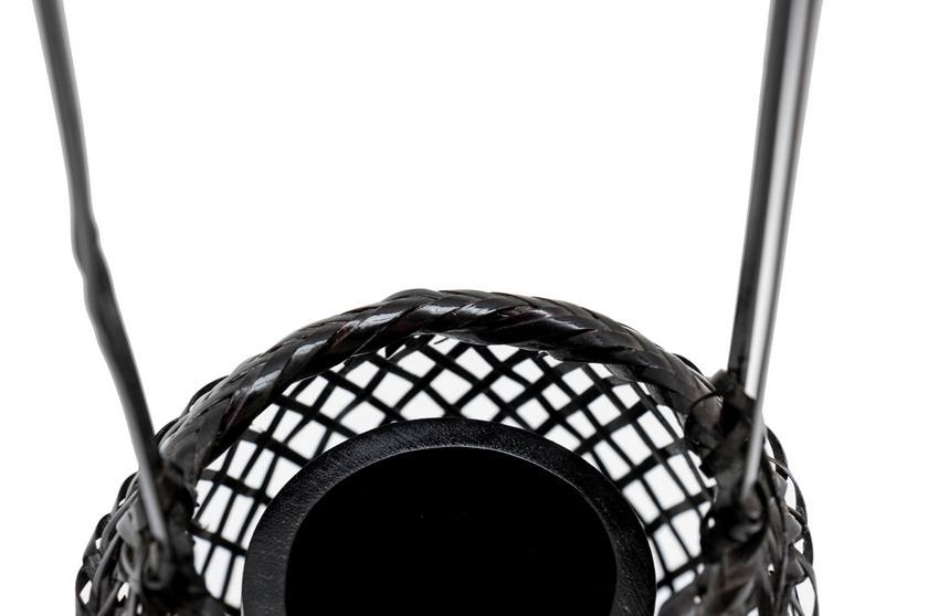 Panier à ikebana laqué noir, de petite taille, réalisé en lamelles de bambou. L’anse de forme rectangulaire n’est en fait qu’une seule lamelle fendue et fixée dans le tressage, par quatre nœuds rattachés à une dense couronne. Le corps bombé est fuselé dans un motif de losange et retenu à la base par un fond avec un motif d’arête de poisson.