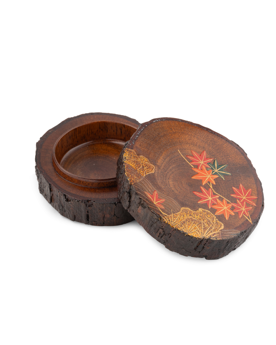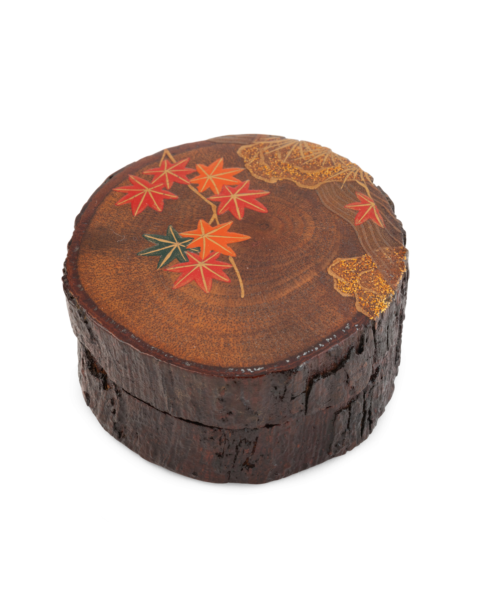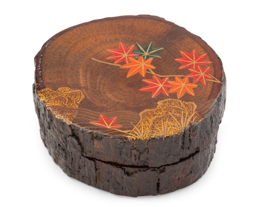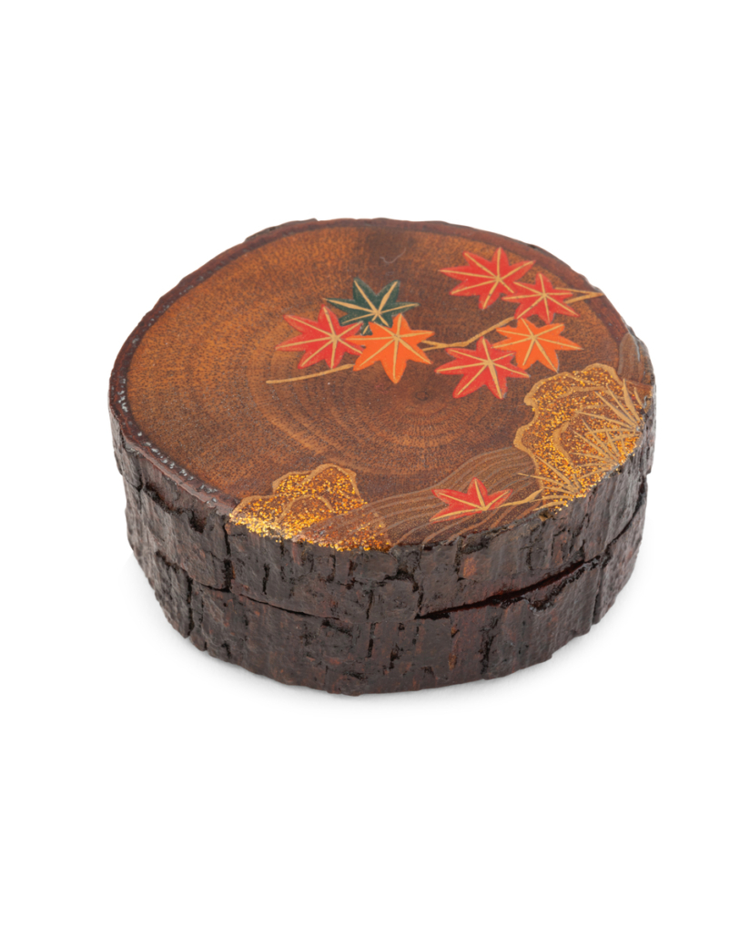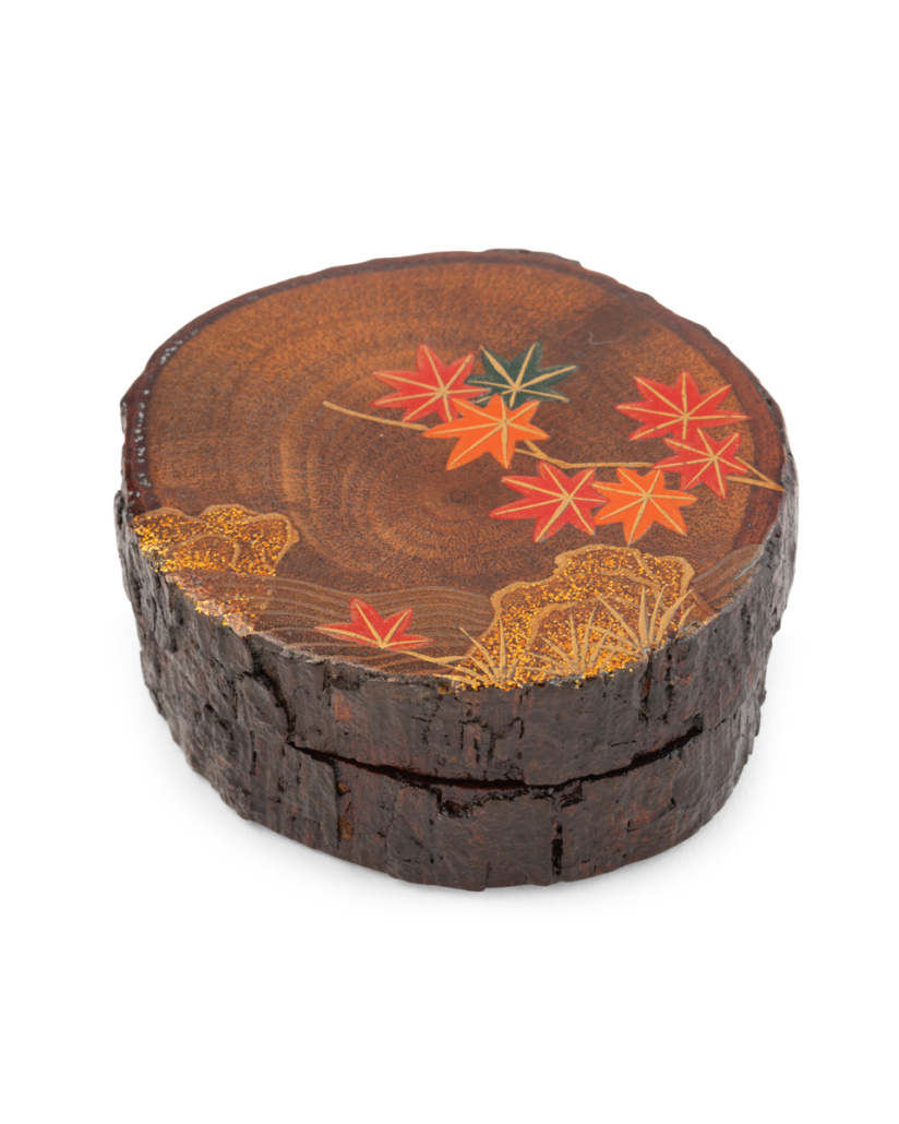 Très élégant petit kobako ou boite a encens en bois naturel laqué a décor de feuille d’érable. La branche d’érable automnale semble enjamber une rivière, chargée de feuille de différentes couleurs, oranges rouges et noire. Une des feuilles rouges est tombée dans la rivière, des pierres en Nashiji en suggère le contour.