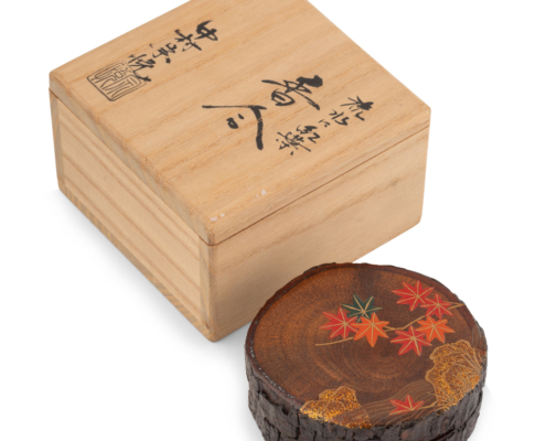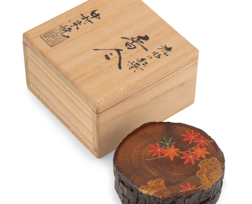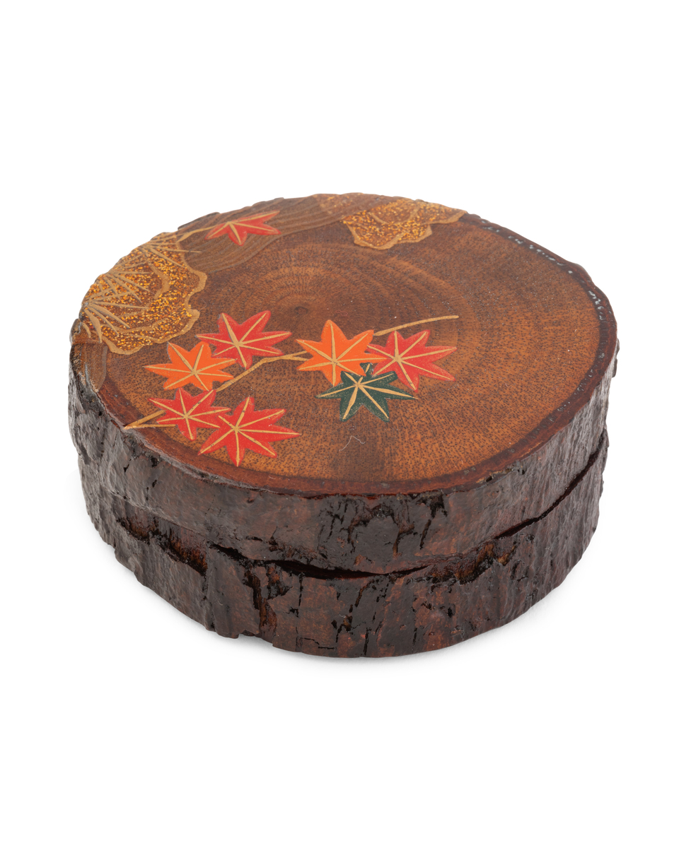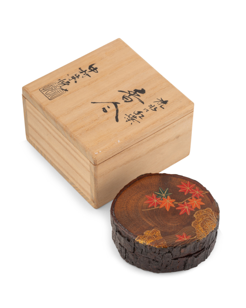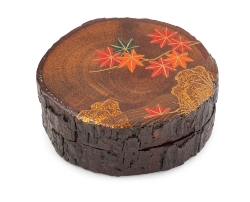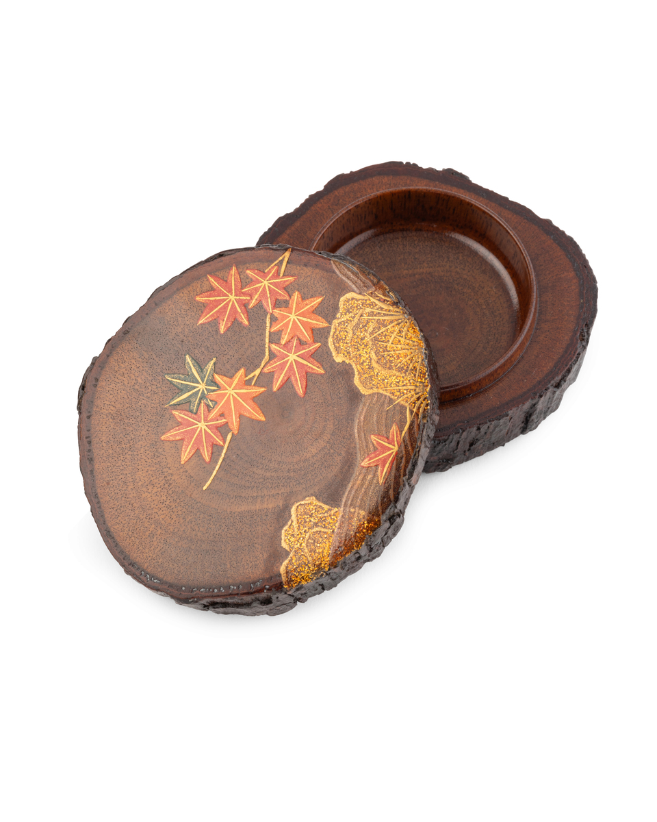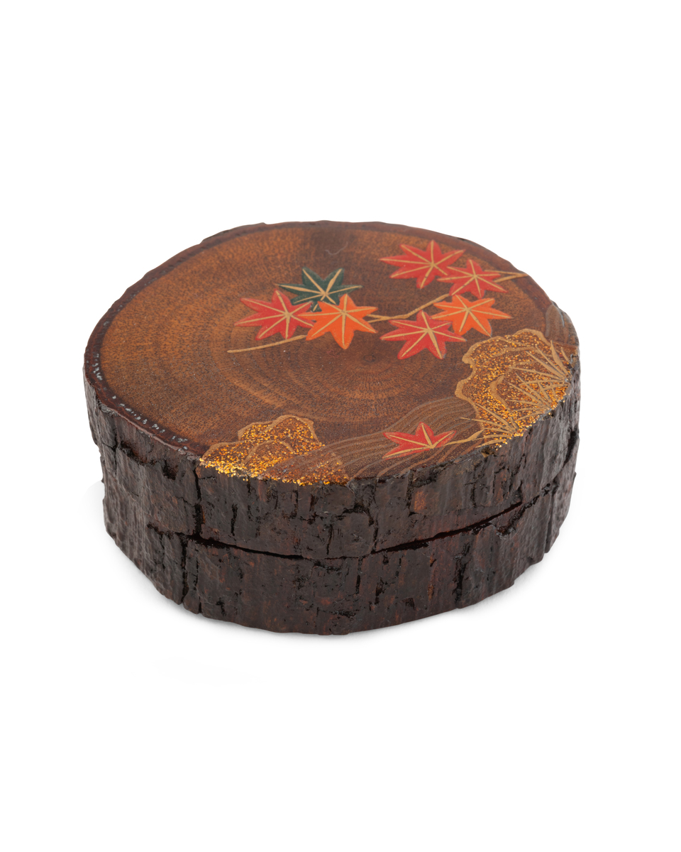 Très élégant petit kobako ou boite a encens en bois naturel laqué a décor de feuille d’érable. La branche d’érable automnale semble enjamber une rivière, chargée de feuille de différentes couleurs, oranges rouges et noire. Une des feuilles rouges est tombée dans la rivière, des pierres en Nashiji en suggère le contour.