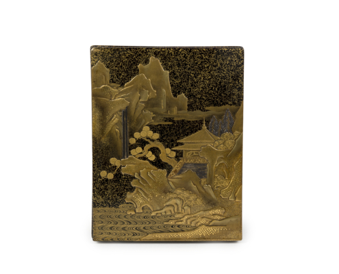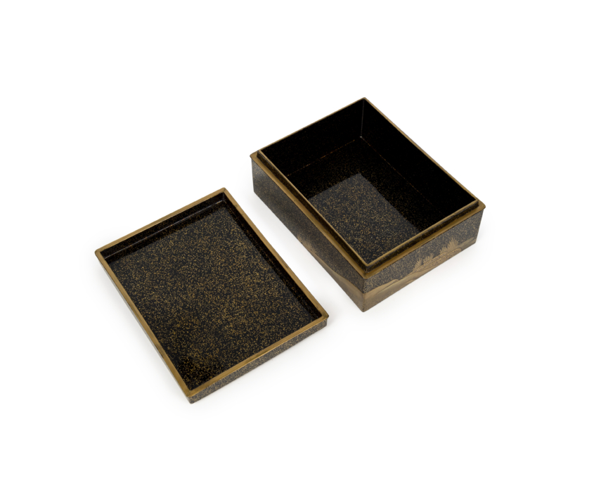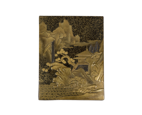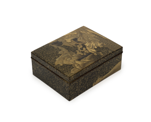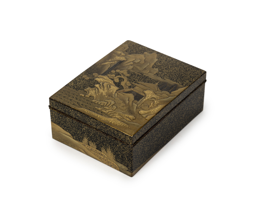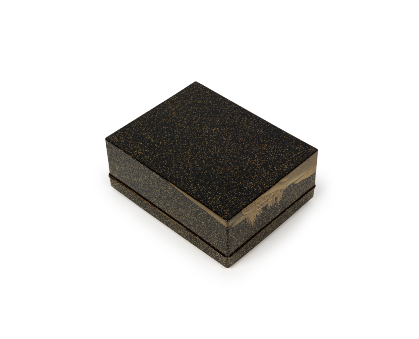 Intéressant kobako en laque nashiji sur fond noir décoré sur son couvercle d’une scène de pavillon (château) au bord d’une rivière dans un paysage karstique. Sur deux de ses faces, avant et gauche, se déploie un second paysage de berge et de roseaux où sont retournées deux embarcations réalisées en burgo couvert d’un motif de tressage en laque or.