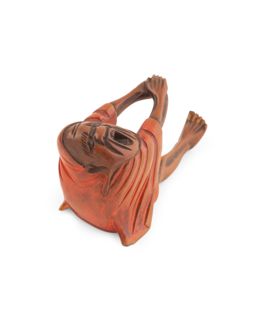 Netsuke polychrome en buis représentant Daruma baillant, son habit est laqué rouge.