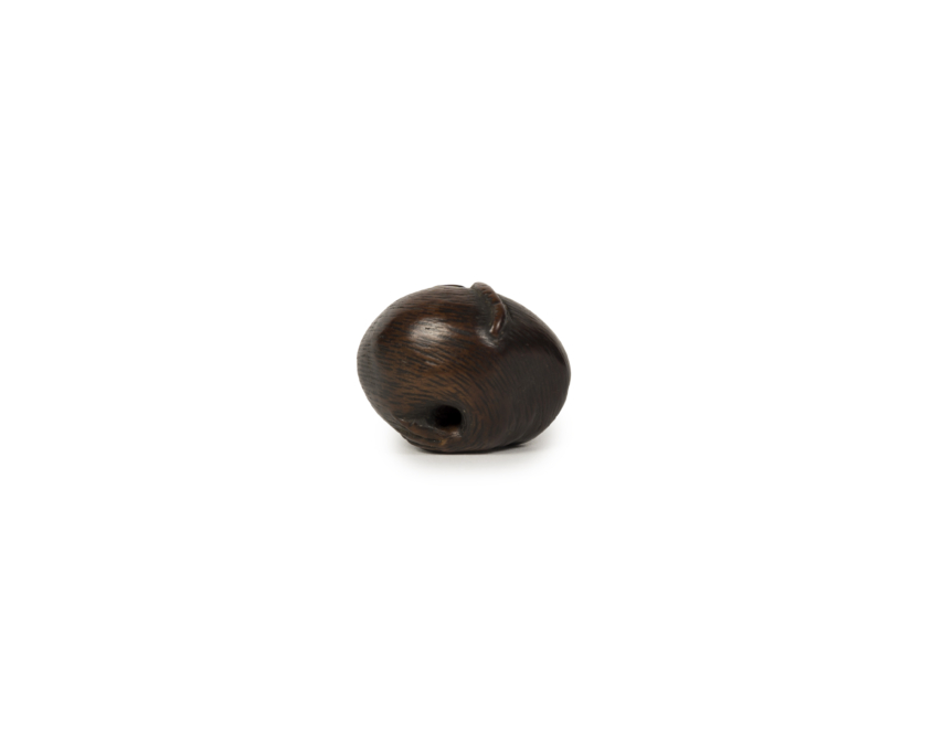Netsuke en buis représentant une souris recroquevillée sur elle-même, retenant sa queue entre ses petites pattes. Le rendu très réaliste du poil et la patine d’usage à la couleur intense ne font que souligner le traitement naturaliste de ce type sujet, typique du milieu de l’ère Edo.