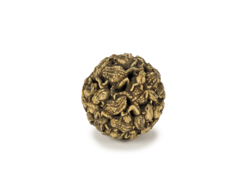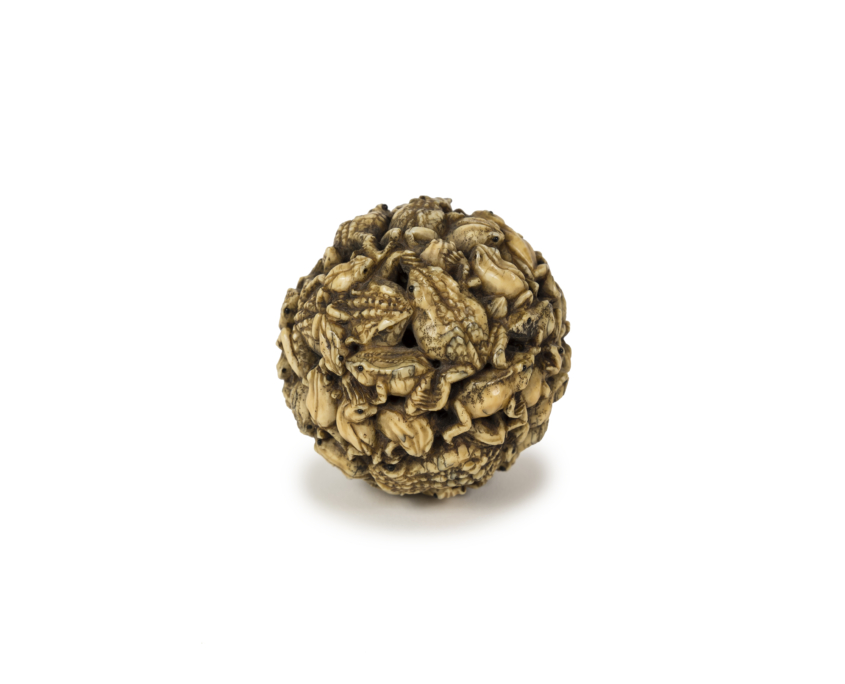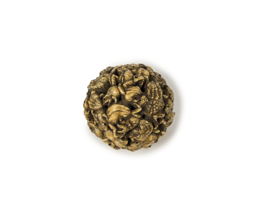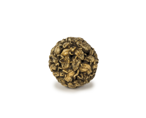 Impressionnant okimono sphérique entièrement sculptée d’un amoncellement de batraciens dont les yeux sont incrustés de corne brune et rehaussé à l’encre de chine. Des crapauds et des grenouilles de tailles et de textures variées sont enchevêtrées ensembles dans une prouesse de sculpture dont la finesse et le sens du détail témoignent.