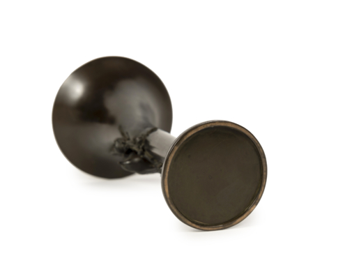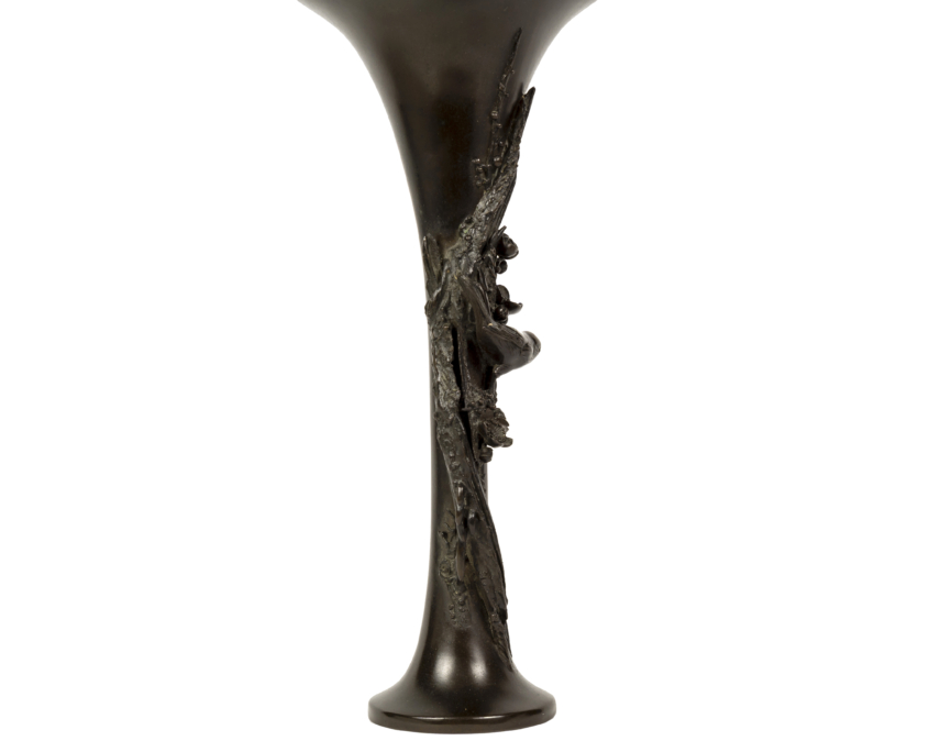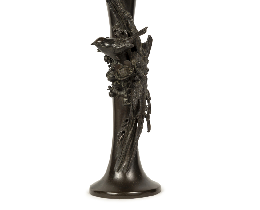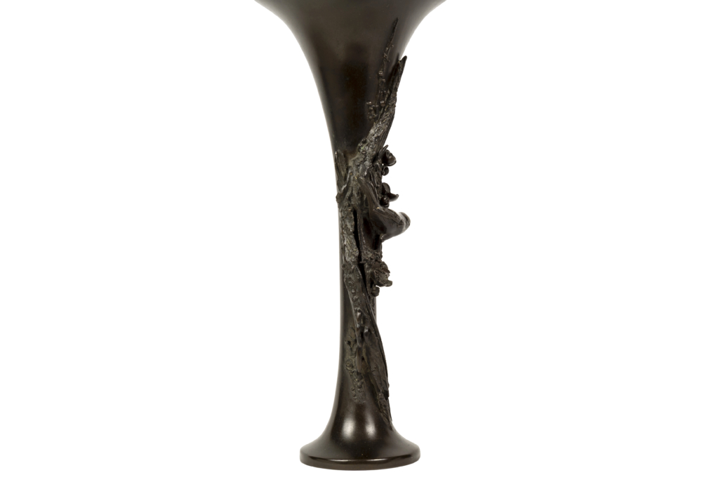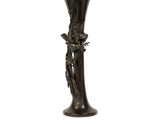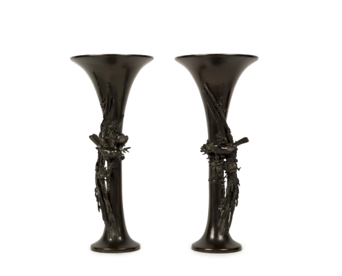 Paire de vases cornet en bronze à patine noire et au col fortement évasé représentant un moineau sur une branche de cerisier.