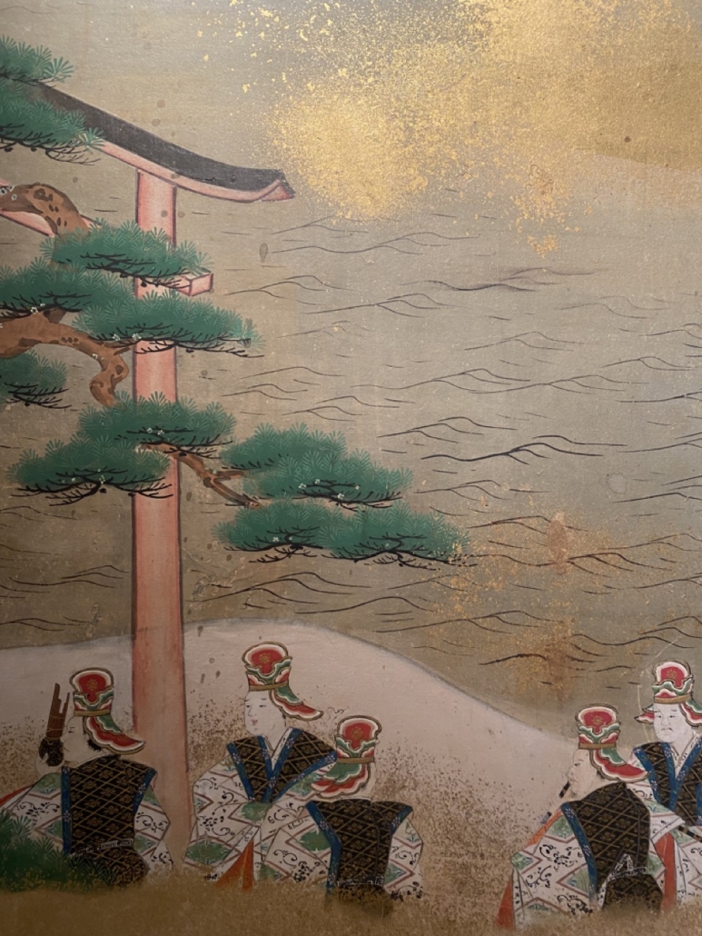 Le prince Genji est venu en pèlerinage suite à son exil de deux ans après de multiples histoires d’amour. Sorte de punition, cet épisode est un moment d’épreuve typique de la littérature japonaise. Il se rend au sanctuaire pour remercier les dieux, moment qui amorce le début de la gloire.