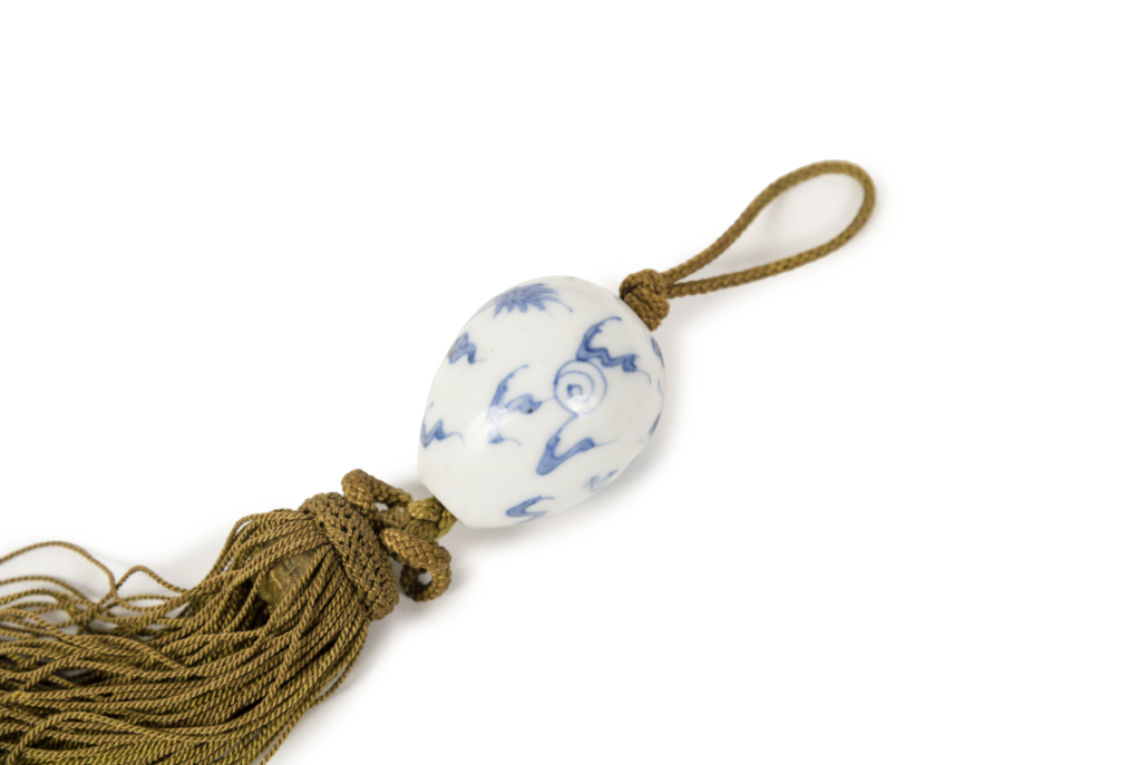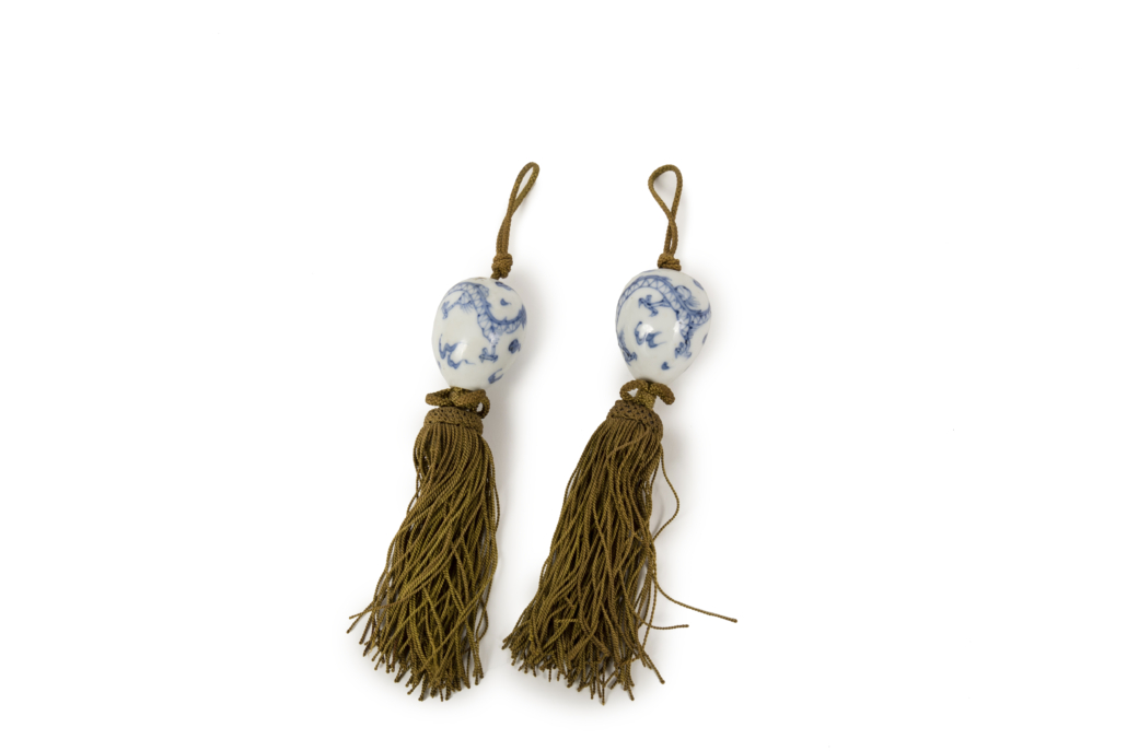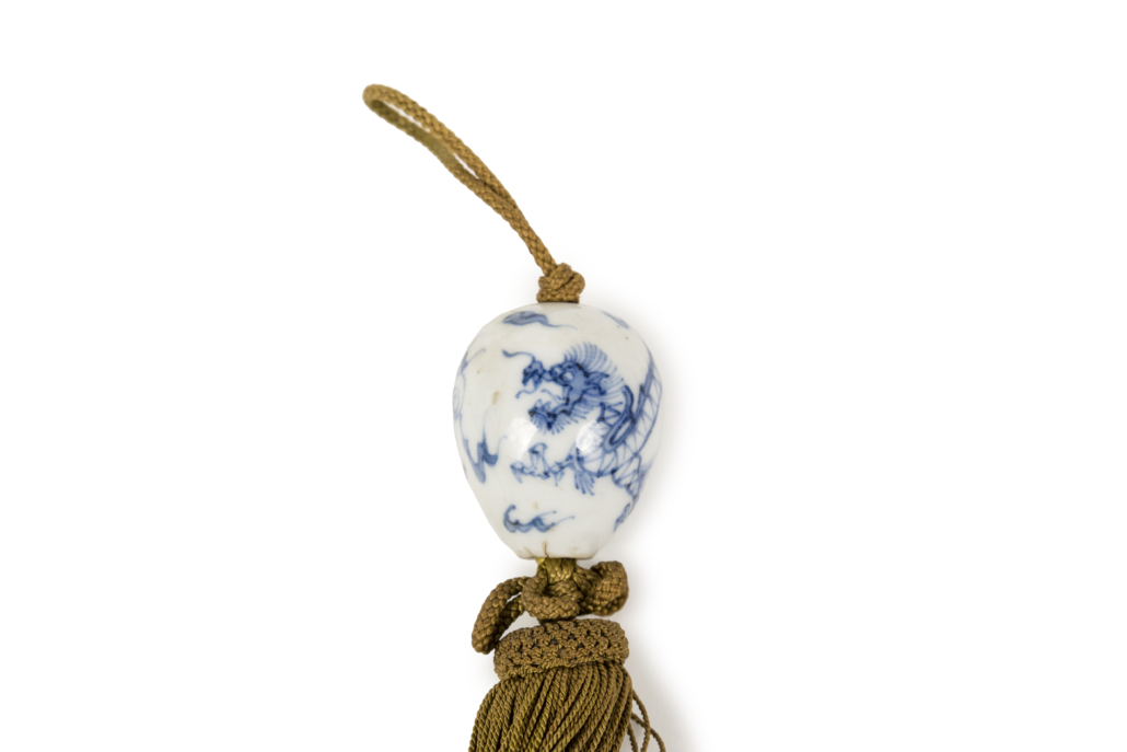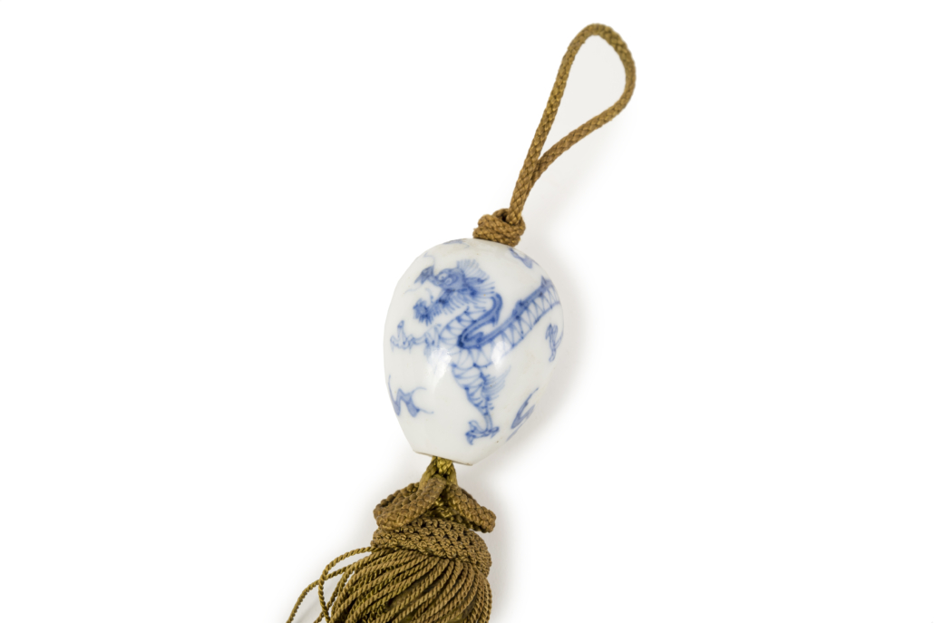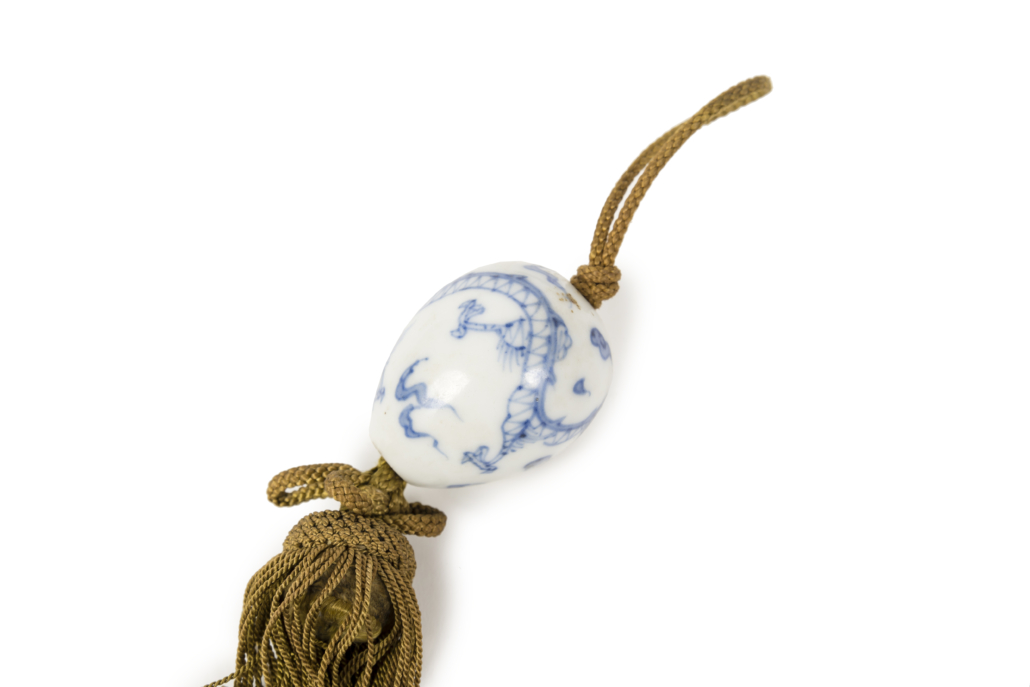 Paire de poids de kakemono, (fuchin) en forme d’œuf réalisés en porcelaine blanc bleue (possiblement Hirado) et décorés d’un dragon à trois griffes. Les fuchin sont utilisés afin de garantir la rigidité du tissu ou du papier des kakemono. En effet ceux-ci étant stockés sous forme de rouleaux mais étant exposés à plat au mur, ils nécessitent d’être maintenus afin de ne pas perdre en lisibilité.