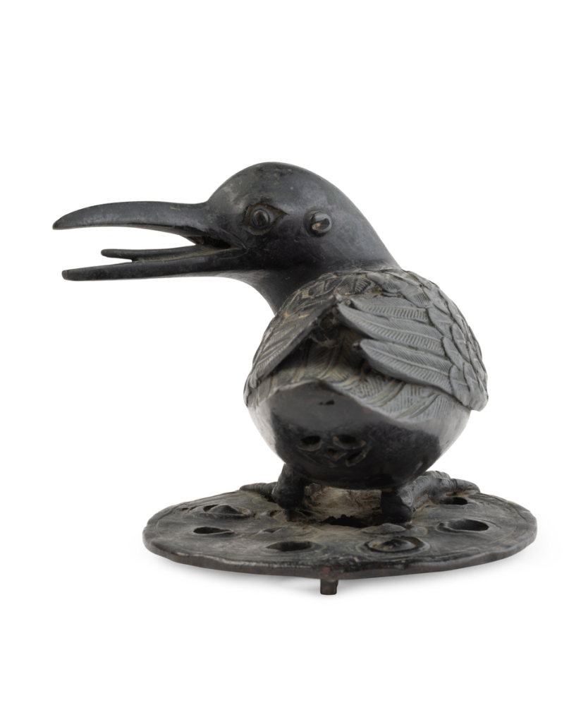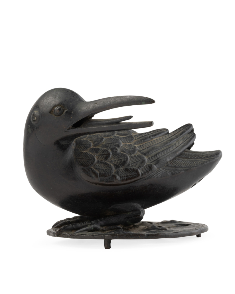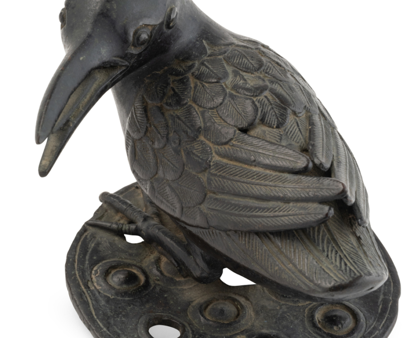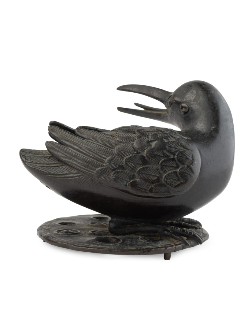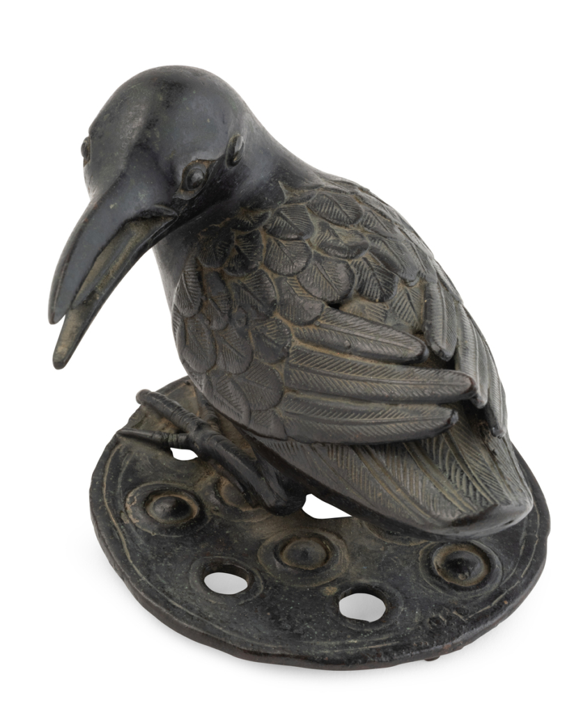 Imposante sculpture en bronze formant un brûle-parfum et représentant un martin pécheur reposant sur une feuille. Le martin pêcheur, reconnaissable à son plumage éclatant est aussi connu pour son agilité et sa précision. Sa capacité à s’élancer rapidement dans l’eau pour saisir ses proies le font associer aux opportunités et au fait de de les saisir de façon décisive et au moment opportun. Au Japon en particulier il est symbole de chance, son image est utilisée pour repousser de mauvais esprits. Dans la mythologie chinoise il est un symbole de bonne fortune et apporterai la prospérité et un mariage heureux.