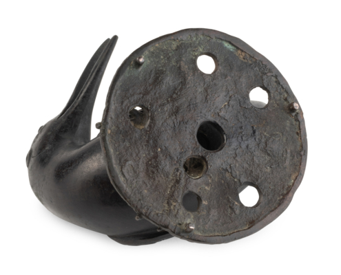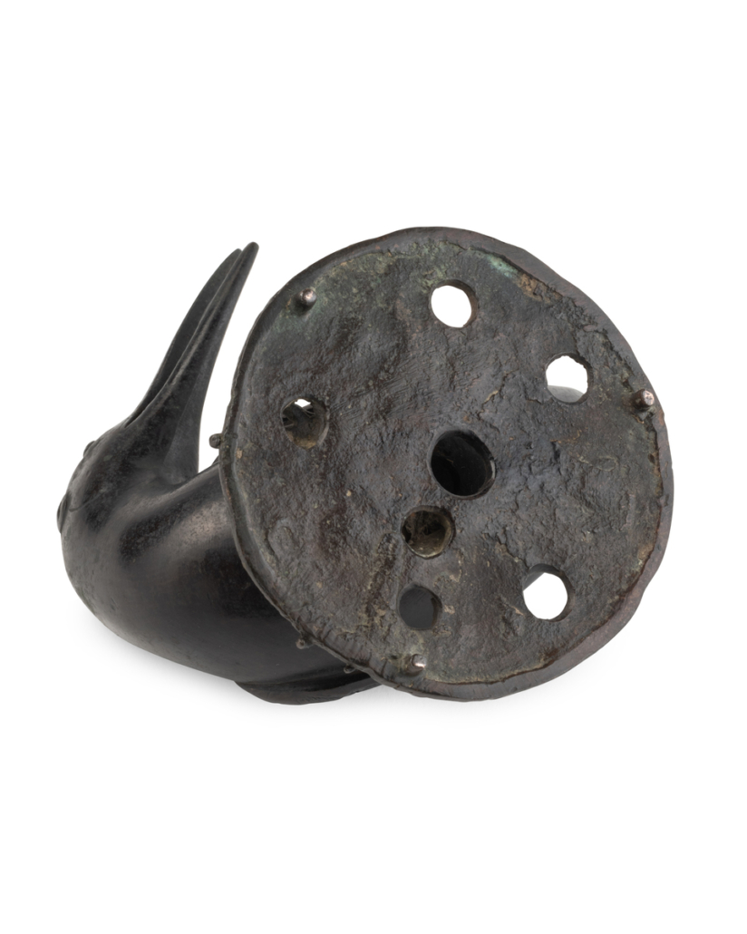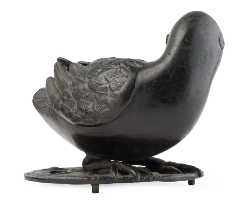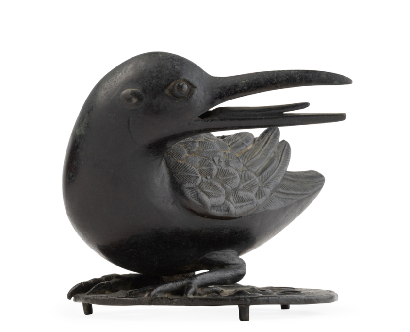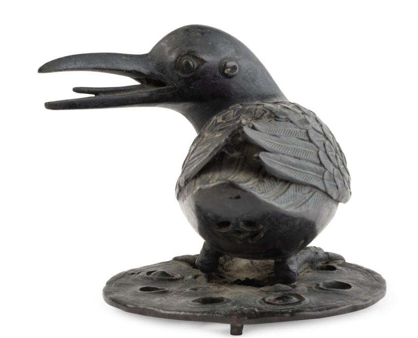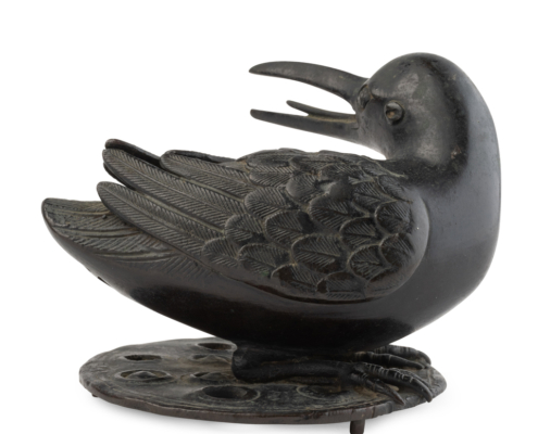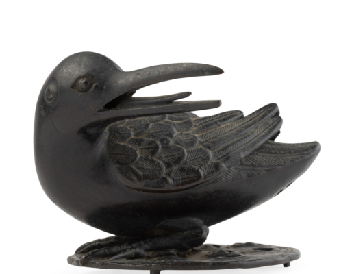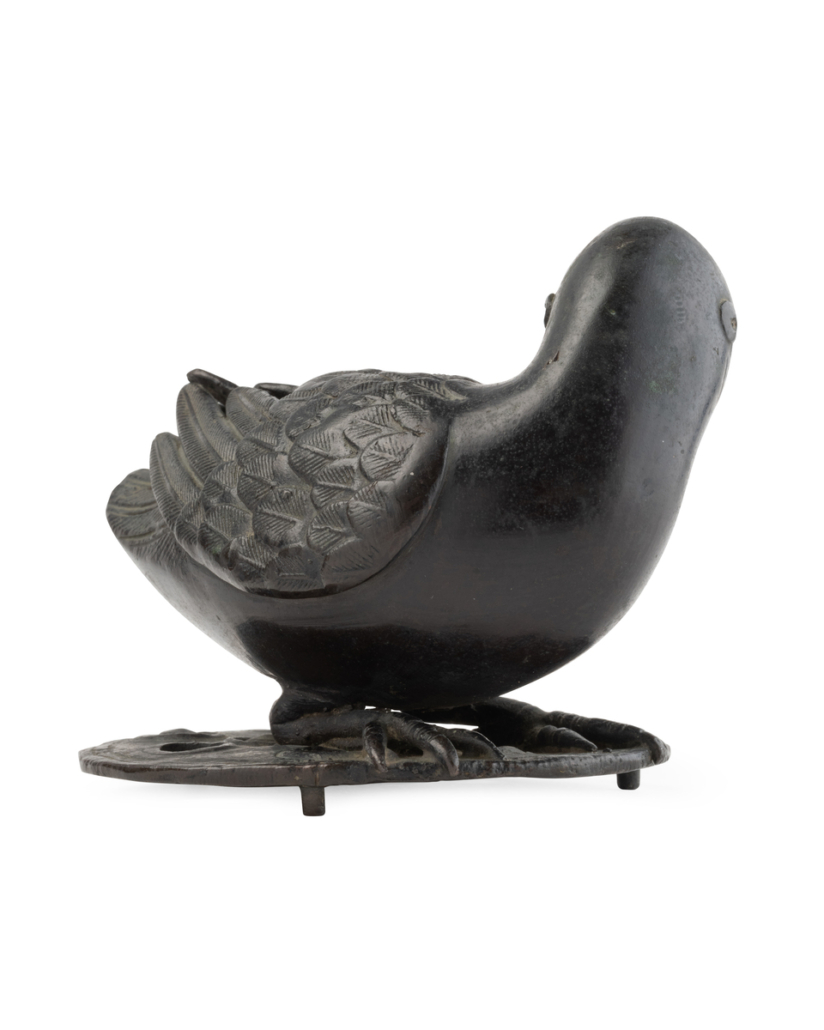 Imposante sculpture en bronze formant un brûle-parfum et représentant un martin pécheur reposant sur une feuille. Le martin pêcheur, reconnaissable à son plumage éclatant est aussi connu pour son agilité et sa précision. Sa capacité à s’élancer rapidement dans l’eau pour saisir ses proies le font associer aux opportunités et au fait de de les saisir de façon décisive et au moment opportun. Au Japon en particulier il est symbole de chance, son image est utilisée pour repousser de mauvais esprits. Dans la mythologie chinoise il est un symbole de bonne fortune et apporterai la prospérité et un mariage heureux.