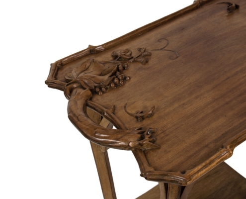 Le plateau supérieur présente un décor de lézards et de vigne en bois sculpté. Deux lézards sont situés de part et d’autres du plateau, dans le coin supérieur droit et le bord gauche. L’entourage du plateau est un sarment de vigne et constitue les poignées, agrémentées de pampres de vignes et de grappes de raisins.